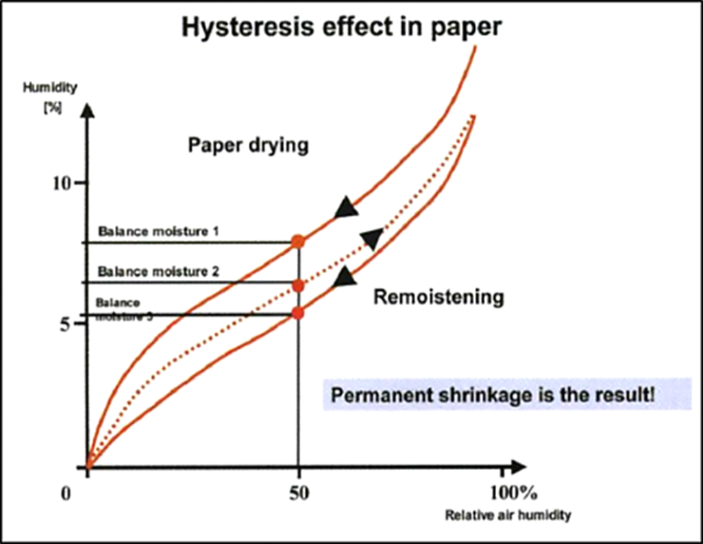 El papel cuando se humecta crece y cuando se seca se encoge, pero nunca regresa a su tamaño original y además nunca deja de ocurrir este efecto, se repite cuantas veces sea realizado el ciclo de humectación y secado. Este efecto se llama Histéresis del papel.